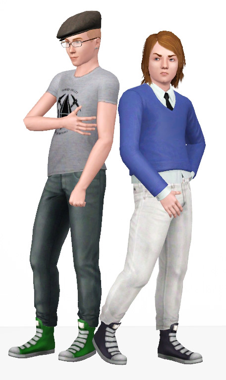 These have been on my to do list for ages and I'm so glad I finally found the drive to make them. Today I give you two things: a pair of strappy high top shoes and a pair of skinny jeans to go with them. By themselves they might look a tad wonky mixed with EA meshes. The shoes feature my initials on the tongue in an overlay. They are based off the T-mobile shoes; I've turned them into high tops, removed the logo on the ankle, added straps and removed the tears and scratches. The pants are an altered pair from the Diesel Stuff Pack; I've added a boxer texture, bunched up the bottoms and turned the grunge overlay into a color channel.